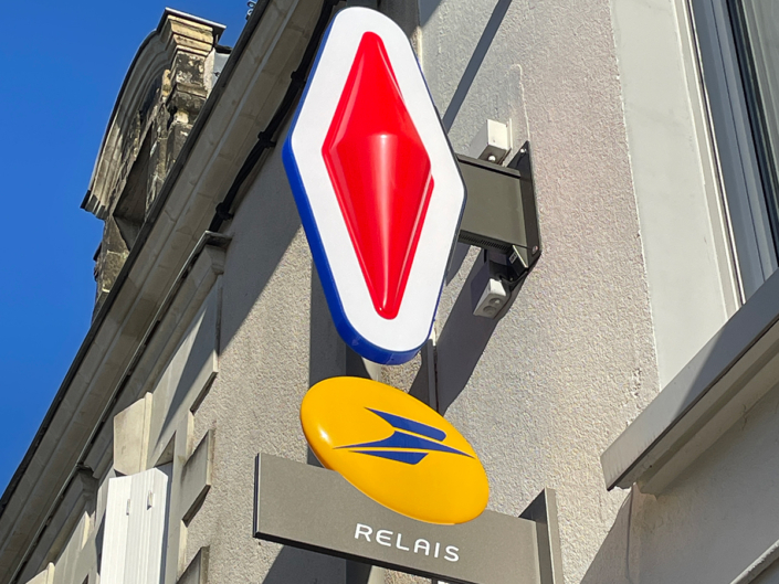 L’enseigne drapeau double face, aussi appelée enseigne perpendiculaire à la façade, est fixée en saillie sur un mur afin d’être visible depuis la rue, dans les deux sens de circulation.